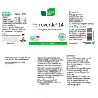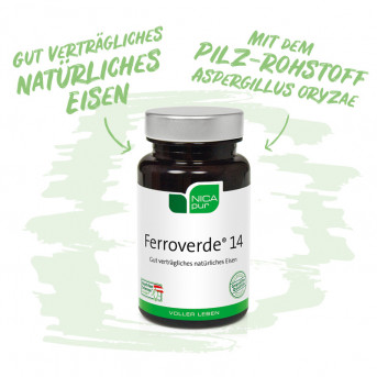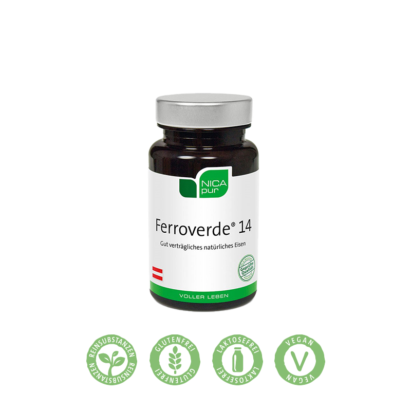 Eine weitere Risikogruppe sind Senioren, da sie sich entweder einseitig ernähren oder generell wenig eisenreiche Kost (wie z.B Fleisch) zu sich nehmen. Um gar nicht erst in einen Eisenmangel zu schlittern, ist eine ausgewogene Ernährung das A und O. Eisen wird vom menschlichen Körper vor allem für die Erzeugung roter Blutzellen benötigt, um den Sauerstoff im Blut transportieren zu können. Rund 2,5 bis 4 Gramm Eisen befinden sich im menschlichen Organismus. Gespeichert wird Eisen vor allem in der Leber aber auch in der Milz und im Knochenmark. Darüber hinaus ist Eisen für viele Zellfunktionen von Bedeutung. So trägt es beispielsweise zu normalen kognitiven Funktionen bei, aber auch zur Reduktion von Müdigkeit und Ermüdung und zur normalen Funktion des Immunsystems. Eisentabletten werden schon lange in der Schulmedizin verwendet. Unsere Eisenkapseln bestehen aus einem Pilz (A. Oryzae) ohne Verwendung von Zusatzstoffen – dies macht es besonders verträglich! Im Vergleich zum gleichnamigen Eisenpräparat Ferroverde® 21 ist Ferroverde 14 niedriger dosiert und enthält 14 mg Eisen (Ferroverde® 21 enthält 21 mg Eisen).